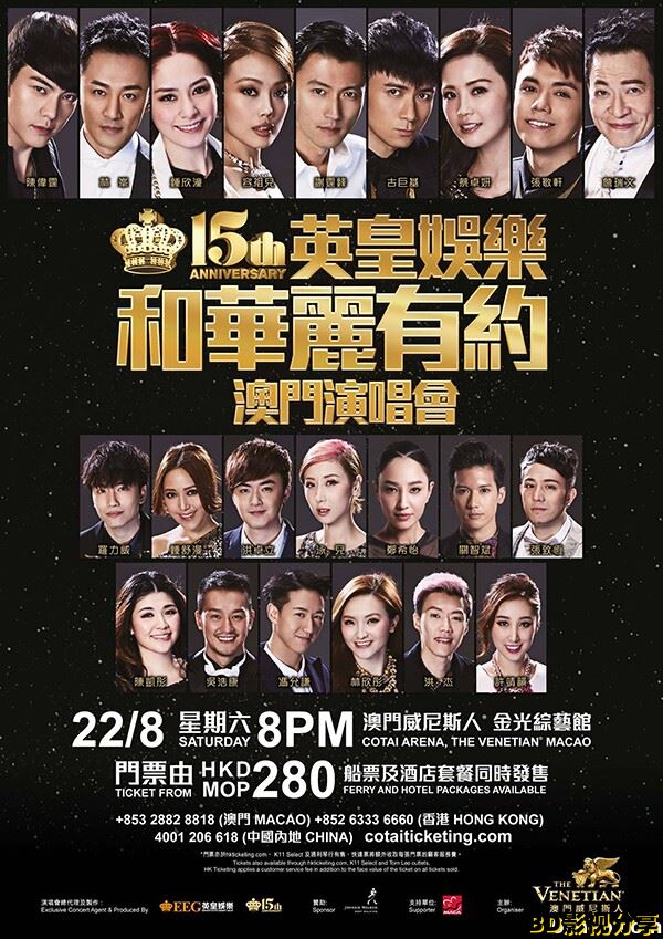 英皇娛樂15週年,旗下歌手總動員於8月22日澳門威尼斯人舉行《英皇娛樂15周年和華麗有約澳門演唱會》,身為大師兄的霆鋒打頭陣,演唱了「玉蝴蝶」和「謝謝你的愛」,Twins勁歌熱舞,當年BOYZ關智斌與張致恒同台演出,還有鍾舒漫、吳浩康、洪卓立、林欣彤、泳兒等分別crossover演唱師兄師姐們的經典歌曲,以及古巨基、林峯、張敬軒、泳兒、陳偉霆、洪卓立、羅力威、馮允謙、林欣彤、許靖韻、洪杰等傾巢而出。而壓軸出場的是天后祖兒,她演唱完「女皇」和「這麼近那麼遠」,之後又邀請眾師弟妹上台合唱「越唱越強」,為演唱會劃上完滿句號。
